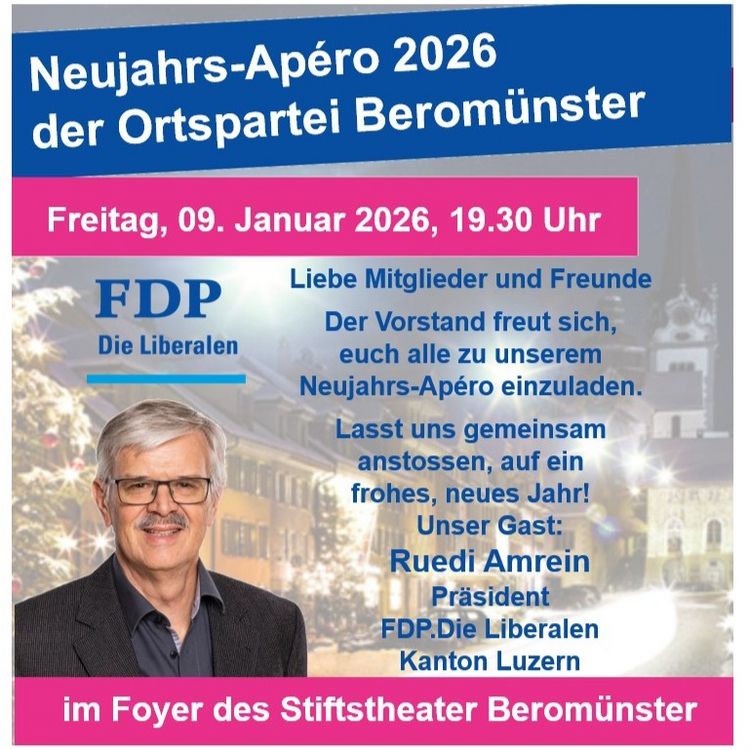 Am Freitag, 9. Januar 2026, findet um 19.30 Uhr im Foyer des Stiftstheaters Beromünster unser Neujahrs-Apéro statt. Begrüssen dürfen wir als Gast unseren Parteipräsidenten der FDP.Die Liberalen Luzern, Ruedi Amrein.